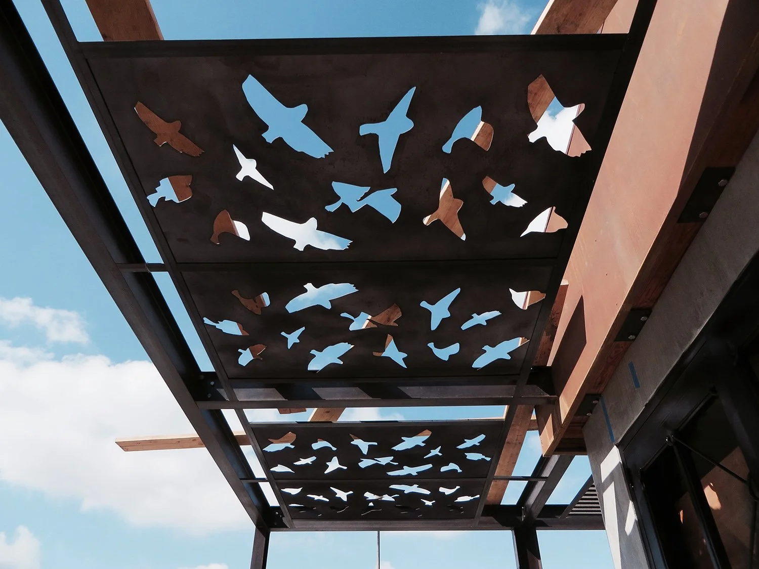 For a smart and sophisticated look, steel beams are formed at the entry and thin metal sheets are laser-cut in the outline of birds flying above that are on-brand with the bird’s nest paneling entryway. Warm LED tube lighting tract compliments the intricate details for the metal structure and concrete panel wall as well.