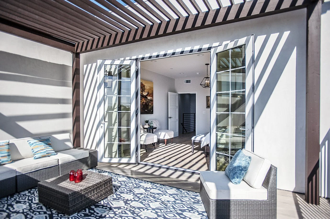 Upon entrance, beautiful drought-resistant plants line the stairway path up to a Classic Modern Mediterranean exterior of smooth white stucco accompanied by beautifully crafted rustic wooden doors, large glass windows, and warm burgundy awnings.