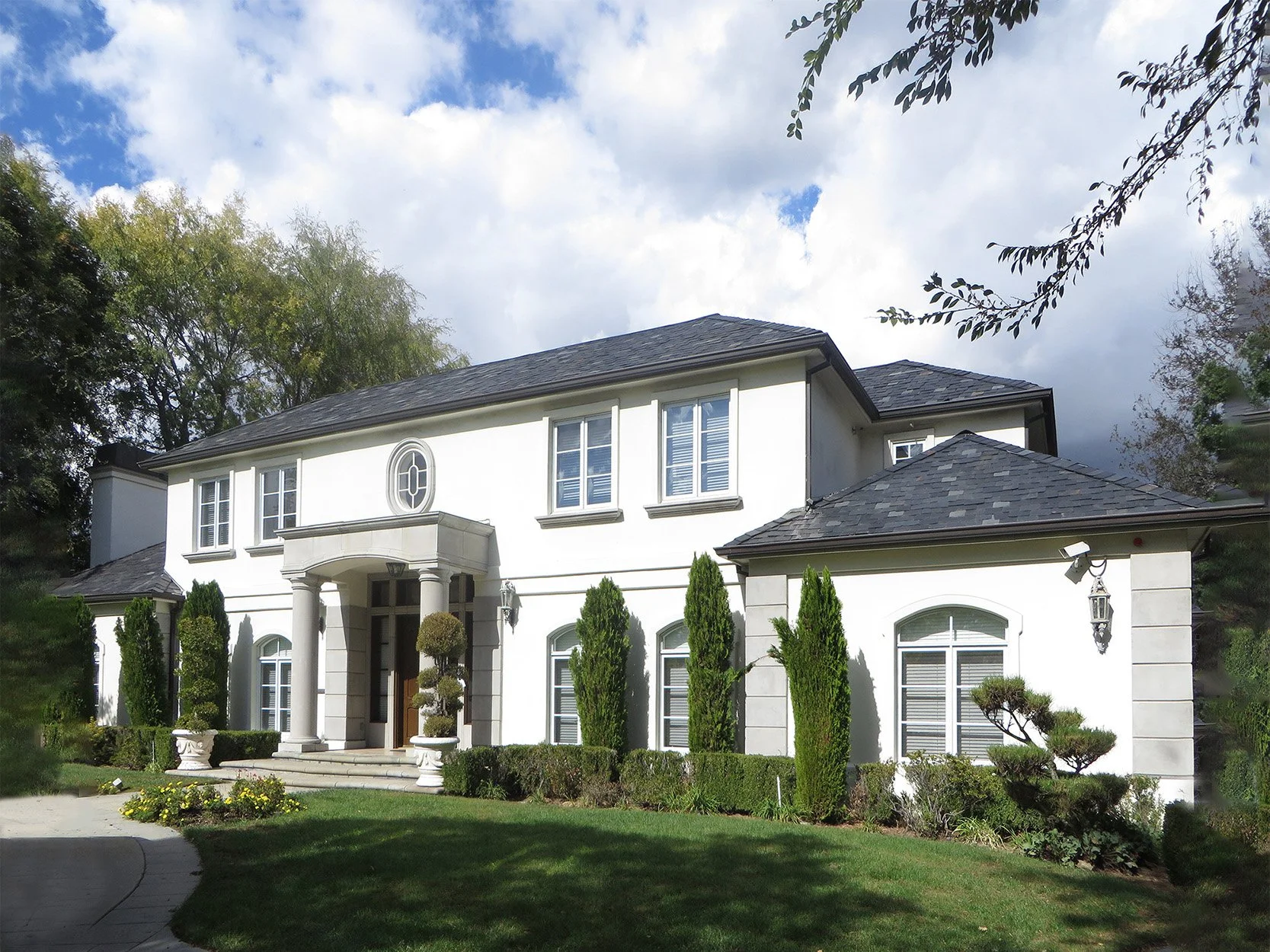 The home is a luxe mansion fashioned with beautifully positioned Ionian pillars and a suspended archway that welcomes the residents to an extravagant modern interior.