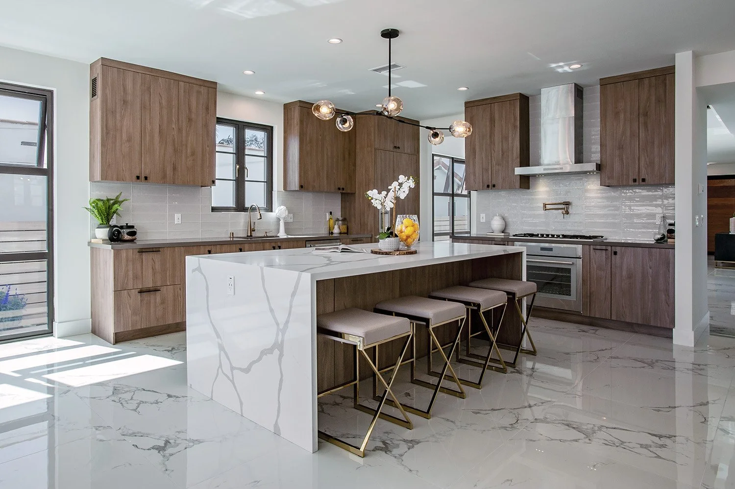 Clean lines meet warm materials, marble countertops paired with custom cabinetry that echoes the home's off-white stucco exterior palette.