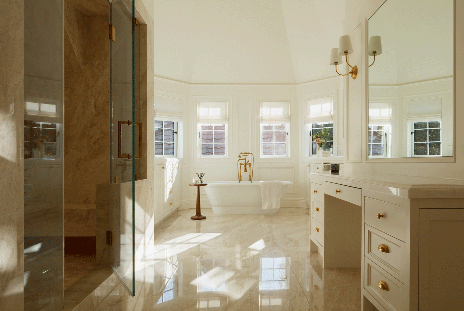 The kitchen balances traditional cabinetry with warm brass fixtures and neutral finishes, timeless rather than trend-driven. Every material was selected for longevity. Every detail is considered for restraint.