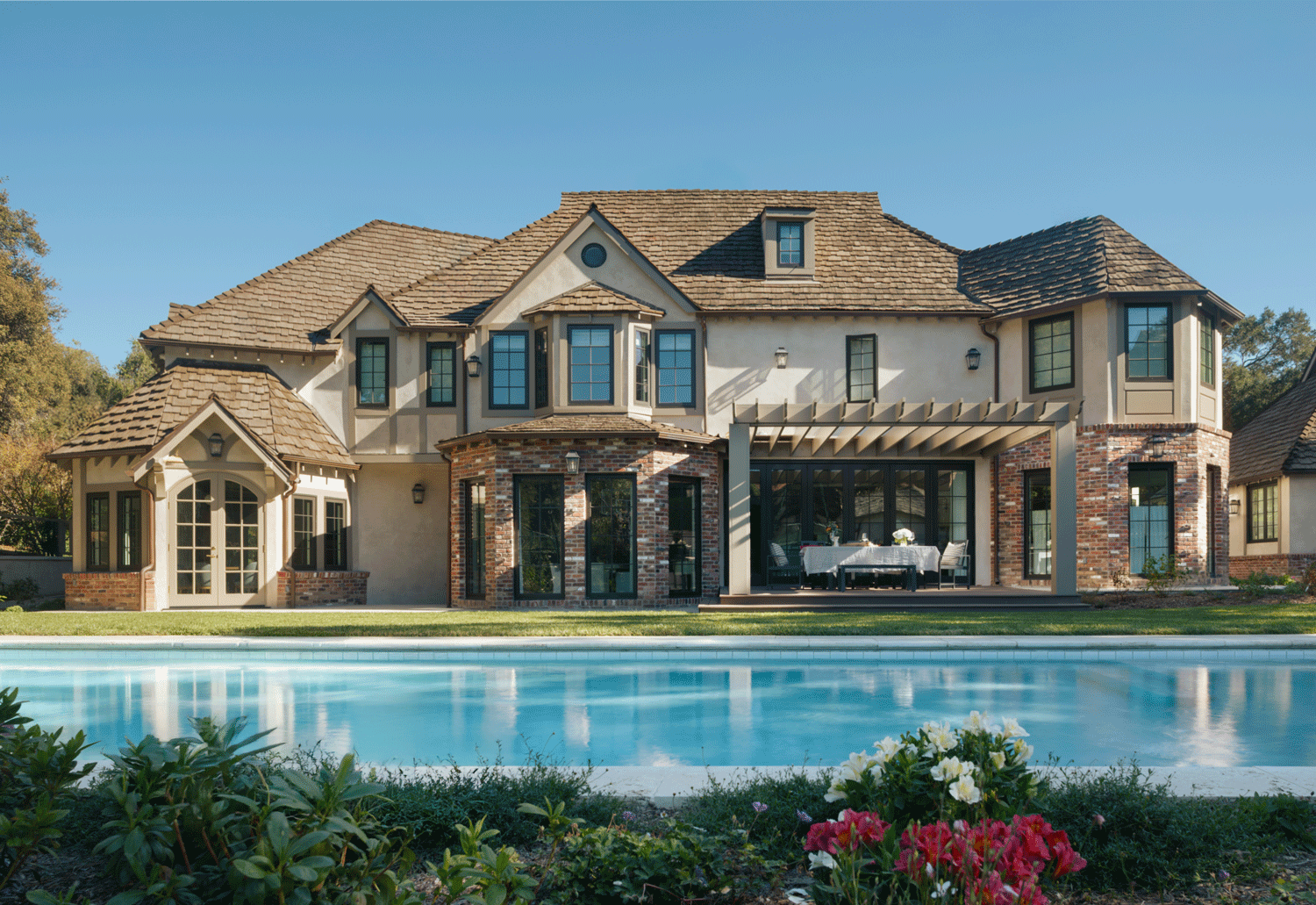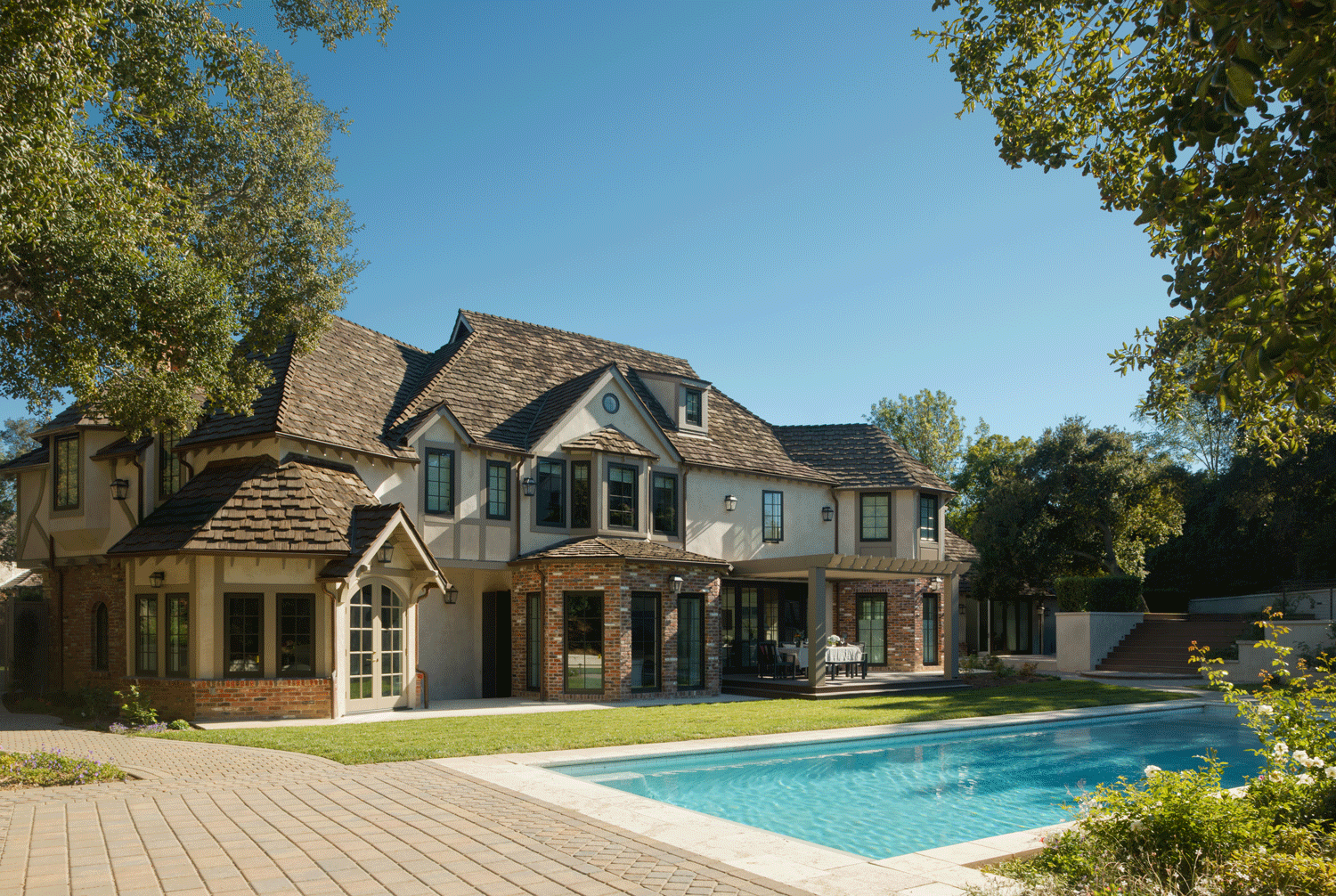The exterior was carefully refined with new stucco applications, improved proportions, and enhanced elevation detailing. Brickwork was thoughtfully integrated to reinforce depth and rhythm. Rooflines were clarified. The massing was strengthened. Rather than modernize the architecture, we allowed the Tudor language to regain its integrity.